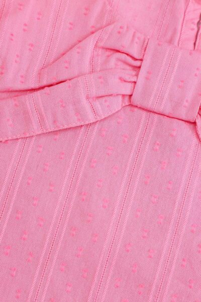 Otkrijte našu predivnu ružastu bluzicu s kratkim rukavima, idealnu za djevojčice uzrasta od 2 do 7 godina. Izrađena od 100% pamuka, ova bluzica pruža iznimnu udobnost i prozračnost, što je čini savršenim izborom za ljetne dane i posebne prigode. Njezin okrugli izrez i suptilna imitacija mašne na prednjoj strani dodaju dašak elegancije i djevojačke čari. Uz praktično zatvaranje na gumbe, oblačenje i svlačenje je jednostavno i brzo. S ECO 5® certifikatom, garantirana je maksimalna sigurnost i ekološka održivost, što je čini savršenim izborom za roditelje. Ova bluzica lako se kombinira s raznim odjevnim komadima, dodajući boju i stil svakoj kombinaciji. Odaberite ovu bluzicu i osigurajte da se vaša djevojčica osjeća posebno i udobno tijekom cijelog dana.