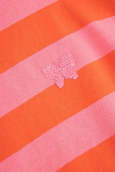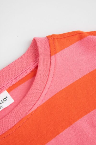 Otkrijte udobnost i stil uz našu ružičastu majicu dugih rukava, savršenu za hladnije dane. Izrađena od rastezljivog pamuka, pruža slobodu kretanja i cjelodnevnu udobnost. Jedinstveni vibrantni uzorak u prugama kombinira ružičastu i narančastu, dodajući energiju svakoj odjeći. Prednji dio majice krasi aplikacija s leptirima od sjajnih šljokica koja privlači pažnju i dodaje šarm. Okrugli izrez i elastične manžete čine majicu ne samo praktičnom, već i modnom. S ECO 5® certifikatom, možete biti sigurni da birate siguran i ekološki prihvatljiv proizvod. Ova majica je izvrstan izbor za zimske dane, savršena za vrtić, šetnje ili obiteljska okupljanja. S kopčama do veličine 98, jednostavna je za oblačenje, što je dodatna prednost za aktivne mališane. Odaberite kvalitetu i stil koje će obožavati i djeca i roditelji!